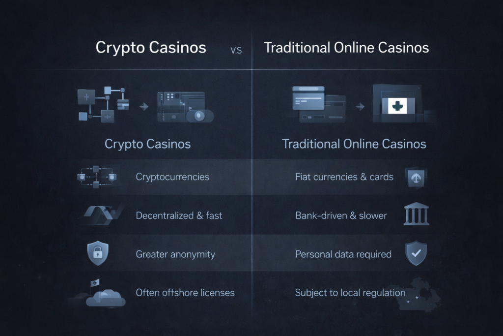 “Crypto casinos differ from traditional online gambling platforms primarily at the structural level. While the games and interfaces may appear familiar, the use of cryptocurrency-based payment systems alters how responsibility, transparency, and financial control are distributed between the operator and the player.”
